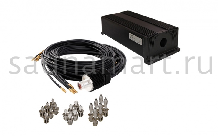 Полный, готовый к установке, комплект включает проектор, волоконный жгут и присоединяемые к концам волокон хрустальные насадки, 18 шт. Металлическая часть кристаллов подзолоченная. Диаметр волокна 0,75 и 3 мм (для кристаллов). Количество и длина волокон: