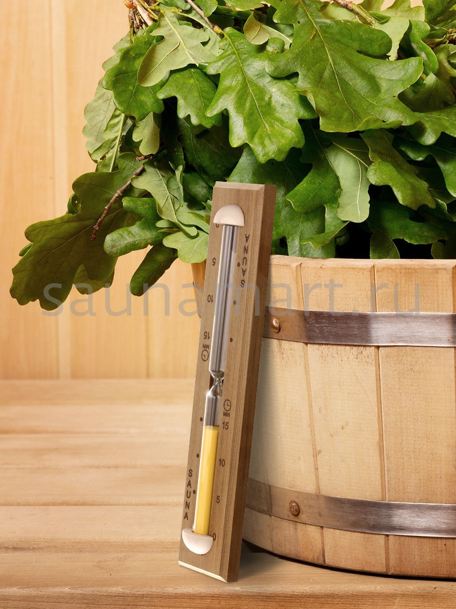 Колба с песком выполнена из жаропрочного стекла, внутри засыпан цветной песок, для лучшего обзора. Прибор не боится высокой влажности и температуры, поэтому идеально подходит для использования внутри парной. Размер изделия: 34 * 6,5 * 3 см.