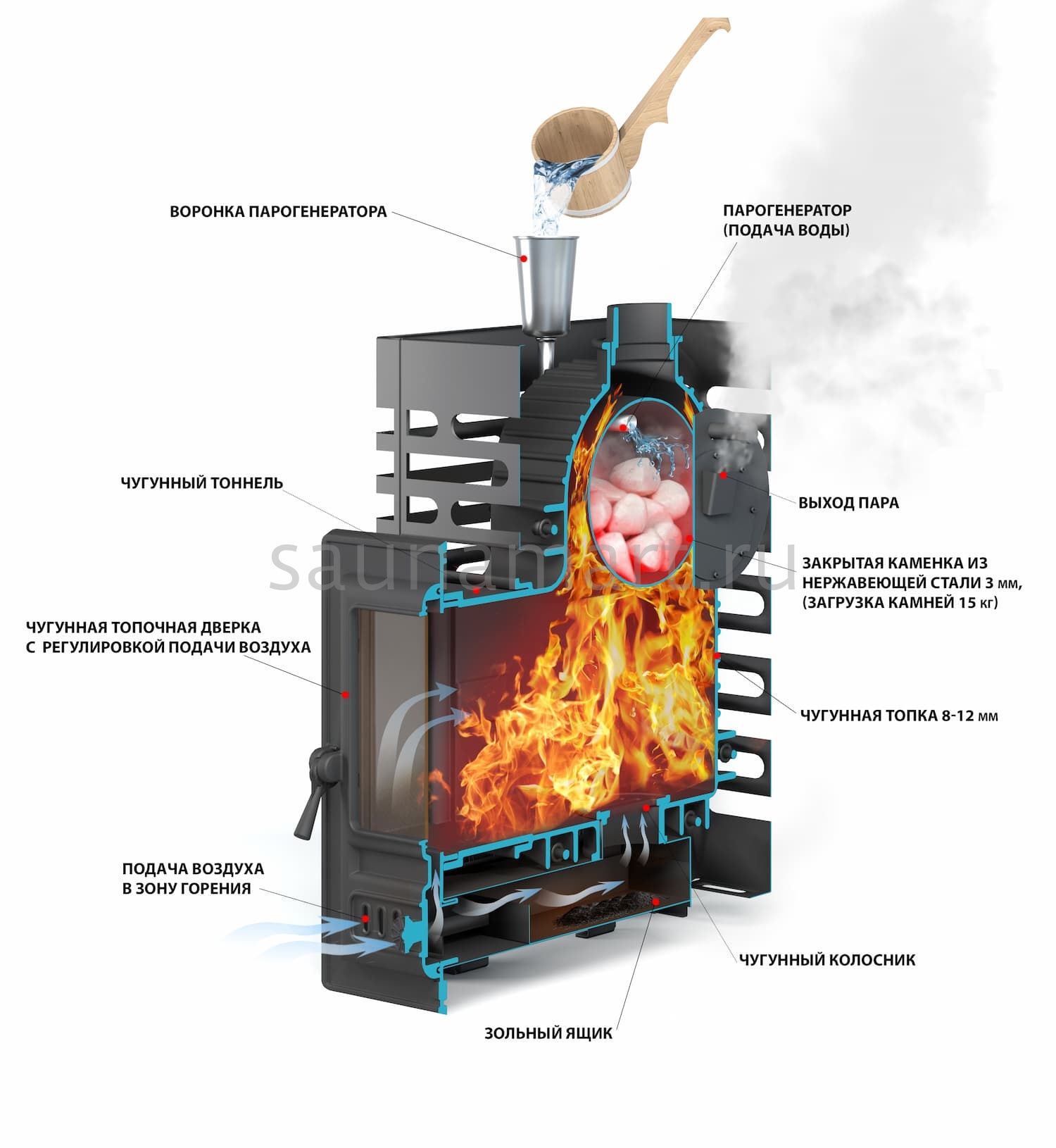 • Материал закрытой каменки: нержавеющая сталь AISI 430