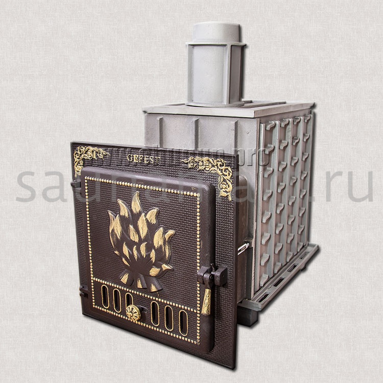 GFS-ЗК 25 — это печь с усиленной каменкой большей массы, с единым углублением внутрь топки для дополнительной укладки чугунного заряда. Теплосъемные шипы, со стороны горения пламени, в разы увеличивают площадь соприкосновения огня с каменкой и ускоряют передачу тепла, а также способствуют лучшему дожигу, смешивая потоки пламени и воздуха, поступающего из воздушника. Эти усовершенствования значительно повышают мощность парообразования печи и выдают большее количество пара при непрерывной подаче воды. Каменка печей GFS-ЗК является незаливаемой.