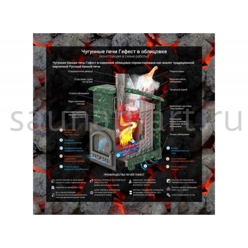Топку печи для бани Гефест ПБ-03П-ЗК при желании можно вывести в смежное помещение за счёт удлиняемого портала. Такая чугунная банная печь обеспечит быстрый и устойчивый нагрев парилки и прослужит намного дольше своих "аналогов" из листа, тем самым доказывая, что чугунная печь — это совершенно иной уровень качества и рабочих характеристик по сравнению с любой другой печью. Срок службы не ограничен, так как чугунные стенки имеют толщину от 10 до 60 мм и никогда не прогорят. Также чугун обладает высокой коррозионной устойчивостью и не заржавеет.