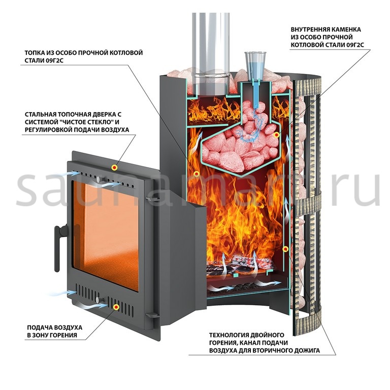 Печь изготовлена из особо прочной котловой стали 09Г2С, рассчитанной на работу при высоких температурах и давлении. Толщина стенок печи составляет 4-6 мм. Топочный тоннель также выполнен из стали марки 09Г2С толщиной 4 мм, что позволяет использовать дрова длиной более 50 см. Топка оснащена каналом для подачи воздуха на вторичный дожиг дымовых газов. Канал проходит по задней стенке топки снизу вверх и подаёт воздух для горения в верхние отделы топки. Такая конструкция повышает экономичность печи и увеличивает КПД агрегата. Съёмный чугунный колосник в сочетании со скошенными краями боковой части стенки облегчает уход за топкой, уборку золы и несгоревших углей. Воздух в зону горения подаётся через поддувало, спереди закрытое дверью печи. Стальная дверь изготовлена из особо прочной стали толщиной 2 мм, оборудована термостойким стеклом и выдерживает температуру до 650 градусов. Подача воздуха для колосникового горения происходит через нижние отверстия двери. Интенсивность горения регулируют закрытием заслонки на отверстиях.