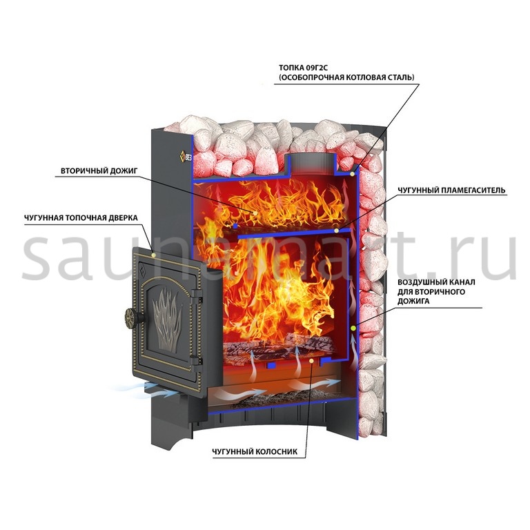 Воздух в зону горения подаётся через поддувало, его количество регулируется зольным ящиком совкового типа. Открытый зольник усиливает горение, закрытый – замедляет его. Чугунный пламегаситель перенаправляет поток горячего воздуха и дымовых газов к задней части топки. Это позволяет снять с печи максимум энергии в единицу времени. Чугунная дверь при нагревании не деформируется, сохраняет свою форму при остывании и предотвращает попадание продуктов горения на пол перед топкой. Печи Везувий СКИФ оснащаются сетками для камней. Сетки могут быть сделаны из металлического прутка или кованой стальной ленты шириной 40 мм. В сетки по всей высоте укладываются камни для бани, обеспечивая большой объём заклада и длительное удержание тепла после прогрева каменки.