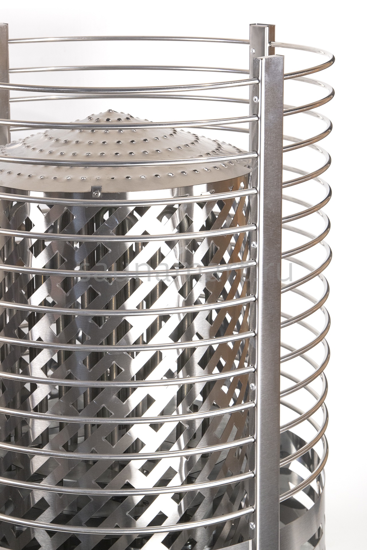 Электрокаменка "Зевс" выполнена в виде широкого цилиндра с радиусными прутьями, что позволяет вместить до 200 кг камня. Нагревательные элементы установлены по центру в специальном корпусе (кожухе), который не контактирует с камнем и поддаваемой водой. Камень закладывается только в пространство между внешним корпусом и до колпака с ТЭНами.