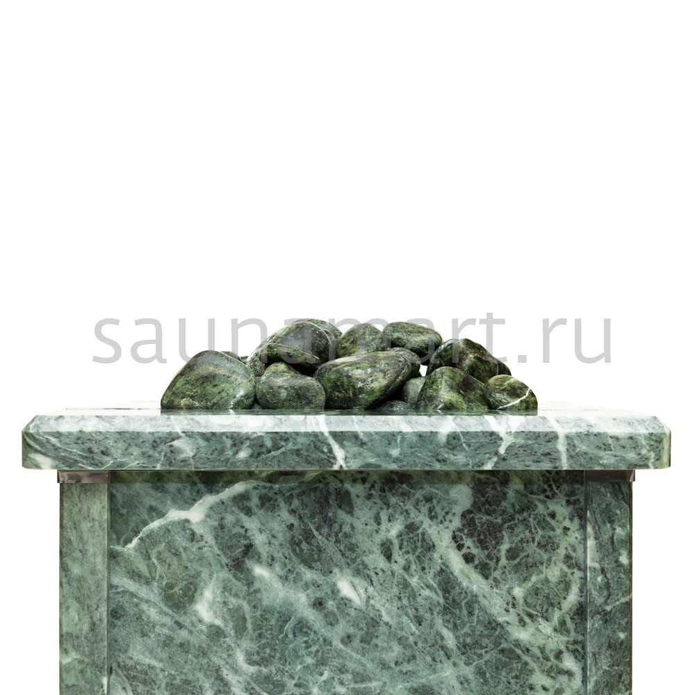 Электрическая каменка со всех сторон облицована натуральным змеевиком. Печь с подобным дизайном стильно смотрится в парильном помещении. Змеевик уже долгие годы используется для внутренней отделки бань. Его называют «аптекарским камнем» за его целебные качества. Минерал оказывает обеззараживающий эффект, положительно влияет на кости, оказывает успокаивающее воздействие и укрепляет иммунитет.