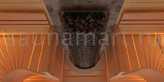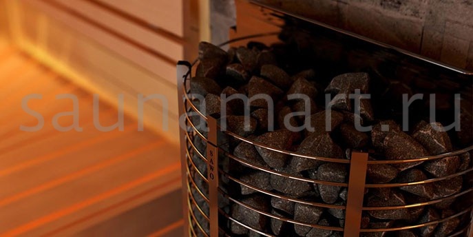 Слегка приплюснутый дизайн. Стоит в среднем ценовом сегменте, качественно прогревает помещение. Есть возможность загружать не слишком большие камни, так как прутья довольно-таки мелкие и не пропускают. Мощность – 6 кВт, на 8 квадратов идеально на средней температуре. Думаю, справится и с банькой пообъемнее.
