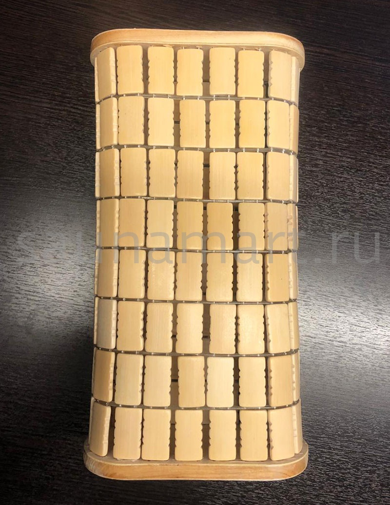 Подголовник выполнен из бамбука, материала, который отличается экологической чистотой, высокой устойчивостью к механическим воздействиям и упругостью. Подголовник позволяет с удобством расположиться на полке во время банных процедур и полностью расслабить тело. При использовании подголовника шея оказывается полностью расслаблена и не испытывает напряжения, а голова приподнята, что предотвращает прилив крови к голове, крайне нежелательный в условиях высокой температуры. Подголовник украшен геометрическим орнаментом из светлых и темных участков, которые чередуются между собой.