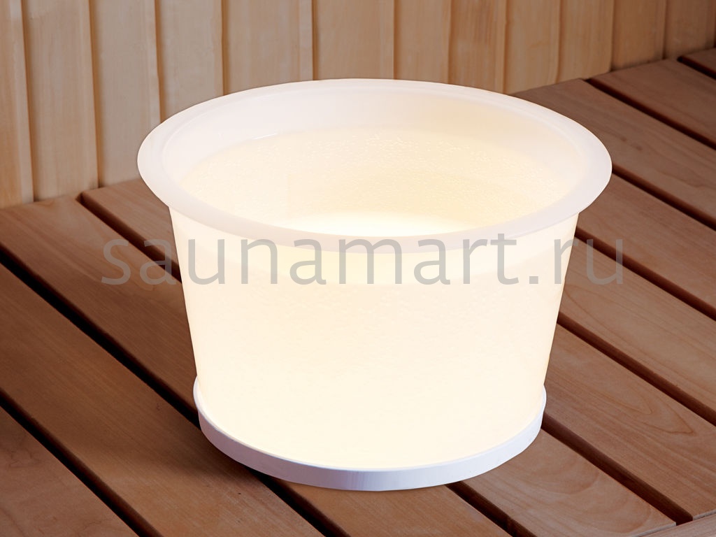 Шайка с подсветкой от Harvia - это современный и стильный способ доставки воды и света в парилку сауны. Основание шайки можен быть установлено на поверхность полка, или же шайка может быть встроена в полок. Светодиодный светильник в основании равномерно освещает шайку, а шайка также освещает окрестности - она изготовлена из оптического пластика с оптимальным рассеянием света.