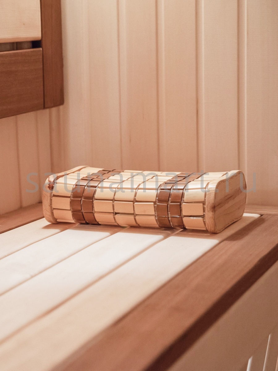 Подголовник позволяет с удобством расположиться на полке во время банных процедур и полностью расслабить тело. При использовании подголовника шея оказывается полностью расслаблена и не испытывает напряжения, а голова приподнята, что предотвращает прилив крови к голове, крайне нежелательный в условиях высокой температуры. Подголовник украшен геометрическим орнаментом из светлых и темных участков, которые чередуются между собой.